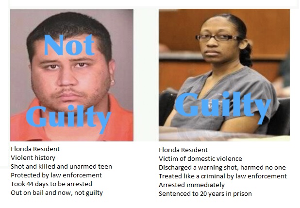 George Zimmerman and Marissa AlexanderAbove all else, we are called to be objective and observe the law. However, in this case, it's Zimmerman's trial that has spawned many conversations of an age-old problem in the United States involving race and the lack of "justice" in the verdict. In another instance involving firearms and Florida residents, we have Marissa Alexander, a survivor of domestic abuse who fired a warning shot to thwart further abuse from her violent partner. She has been sentenced to 20 years in prison while George Zimmerman is a free man. Alexander's case was prosecuted by Angela Corey, the Florida State's Attorney who prosecuted George Zimmerman.