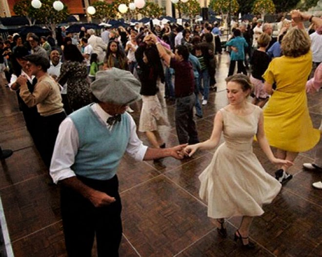Starting Friday evening, May 16th, and continuing every second Friday night through the middle of September, you can come to the open plaza between the Dorothy Chandler Pavilion and the Mark Taper Forum and dance with complete strangers. Imagine this -- After a long week at work, you knock off early on Friday, let’s say 5:30. You have nice set of evening clothes with you, so you can change outfits at work. Guys trim their beards and don their small fedoras while girls slip on colored skirts with long sleeved lace tops and a statement necklace. You head downtown early. The earlier you go, the cheaper the parking is, but you can arrive as late as 6:30 and pay 8 to 12 dollars to park at the Music Center itself. The weather is perfect in a way that only happens in Southern California. It’s warm with a light breeze, and there are no bugs. The sky is golden as the sun starts to set, lighting up the Grand Park and City Hall in the distance below you. You know those temporary moveable dance floors you see at weddings? They put one of those down, but big enough for two hundred people, right in front of the Lipschitz stature to World Peace, and a night of open air dancing ensues. Every second Friday is dedicated to a different dance style. This year the schedule features 60‘s dancing, Colombian Cumbia, Tango, Two-Step, Bollywood, K-Pop, Samba, Disco, Salsa, and more.