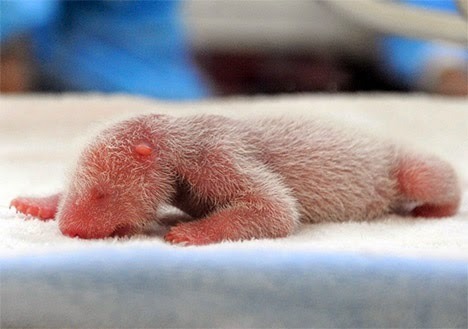 When they are first born, panda cubs are pink, blind, toothless, and completely helpless. They weigh between 3 and 6 ounces, and are about as long as a stick of butter. A stick of rancid pink butter. They look like hairless pink rats and are repulsive to look at (though maybe my particular disgust stems from an encounter with a pink hairless dog in Bali, but that’s another story). They are 900 times smaller than their mothers -- there is no other mammal mother who has babies that are so small compared to her size, which is weird in and of itself.