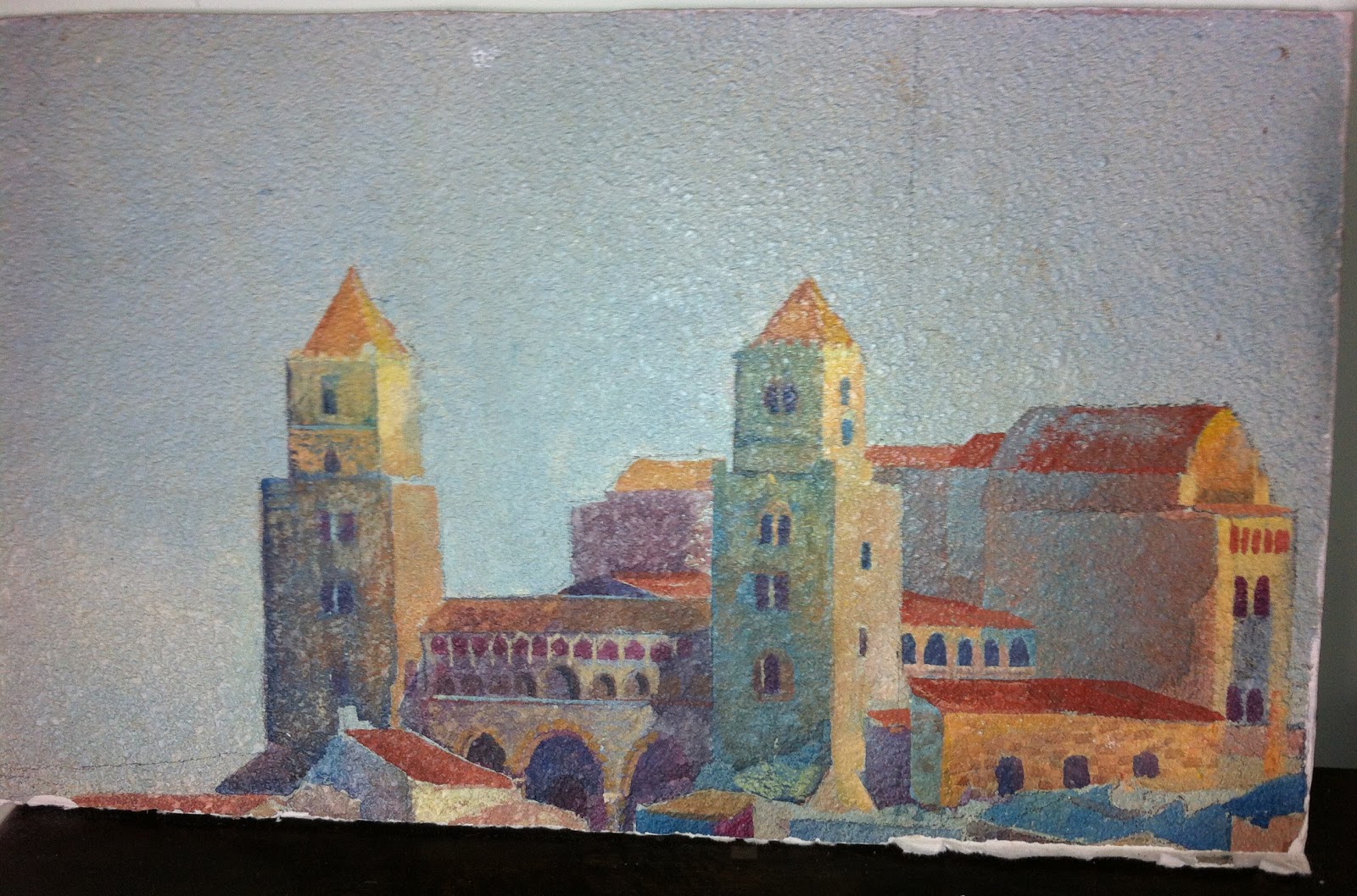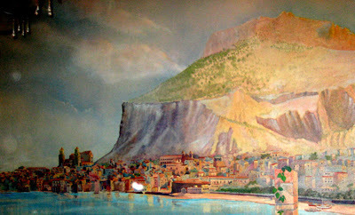 When we returned to Studio City we went to Vitello’s to tell Steve about our trip and he was crushed because we hadn’t eaten dinner with his relatives. We had called once but couldn’t communicate well, we couldn’t reach the right sister, we didn’t think it was crucial, and then we got occupied with our own vacation adventure -- but Steve remained distant. After all, he is Sicilian. It took awhile for him to forgive us, but he did. When the new owner decided to renovate, I begged him for part of the mural and he kindly obliged. The mural is just acrylic paint on drywall so it’s not built to last the centuries, but I got some good pieces,including the section with the Norman cathedral that rises above the town. Each piece is too heavy to frame and too big to hang in the house, so I have them arranged on the walls of the garage. The pieces remind me of the Italian restaurants from my youth, then of Sicily, which reminds me then again of California, and we come again full circle. All I need now is a red booth.