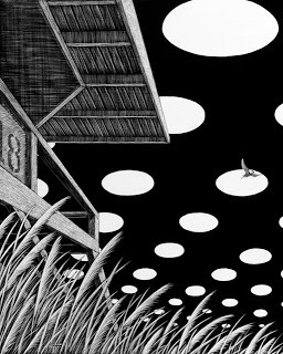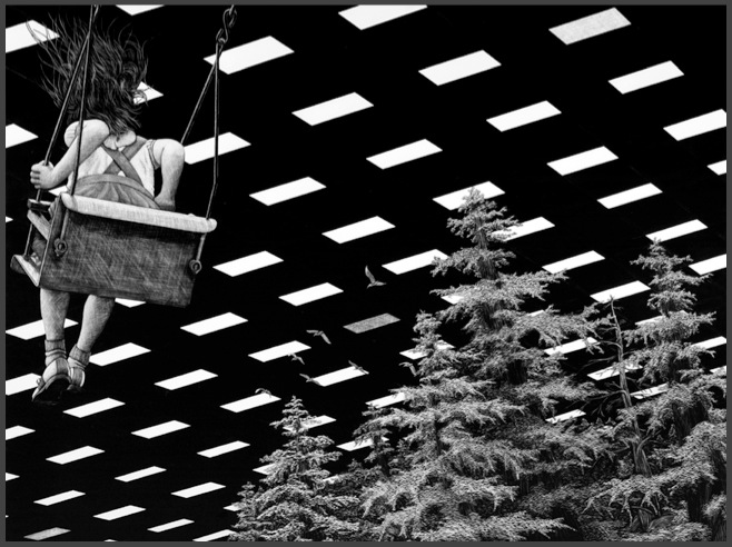 David Trulli is a California artist you should know about. I first met David when I was hired to direct a short documentary about the closing of the Long Beach Naval Shipyard and David was the cinematographer whom the company had hired. We had to create compelling TV out of images of old barracks, rusting ship locks, drained swimming pools, and empty offices. David found a way to shoot the barren mid-Century industrial architecture in a beautiful way, and I found enough characters with great stories to put in those settings that somehow it came to life. I loved his eye, and we stayed in touch. In 2001, I asked him to shoot my short film, Dodgeball,a comedy about a company where to get ahead you must compete in the weekly company dodgeball game. The film pre-dated the feature of the same name, but there’s another story that goes with that. We became friends, and I noticed and admired a few things about him: He is a clothes horse. A lot of Los Angeles cinematographers wear cargo shorts with Hawaiian print shirts, and he said he was tired of being that guy on a set, so he spent some money and graduated up to what he calls “grown-up clothes.” Now he wears suits whenever he works, and he looks good in a fedora. He also inspired me to improve my own wardrobe. He appreciates a good root beer float. When he and his wife Lisa (an amazing editor) came over for dinner in the summer, he enthused about how they are the perfect treat on a hot summer night. David surprised me a few years later when he said he was leaving cinematography to be a fine artist, and that scratchboard was going to be his medium. To me, it seemed daring but risky; much like an actor quitting the theater to become a singer. Yet it worked. He is now a successful fine artist, with his own studio on Hollywood Boulevard, and successful gallery shows every year or show throughout Southern California. In fact, he is part of a show happening right now at the Pacific Design Center featuring black and white art: