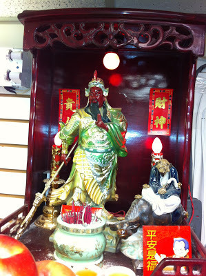 You ride up three floors, step out into an entranceway filled with shopping bags and suitcases, then step through a beaded curtain and into an sun-filled atrium in which sits a massive statue of a stern and red-faced warrior with a long beard, who carries a long pole with a blade -- General Guan Yu, most often called Guan Gong, or Lord Guan. Surrounded by urns filled with burning incense, smaller statues of minor deities and stacks of fruit offerings and flower bouquets, Lord Guan’s wooden face glowers at you, tolerating your presence, as if asking you to speak quickly and explain why you’ve come.