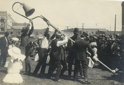 That may be what the original boosters who put in these bells hoped I would think when I see it, but this bell is now an unintended ironic joke on me and every other driver out there who idles past it every morning. The romance is gone.
