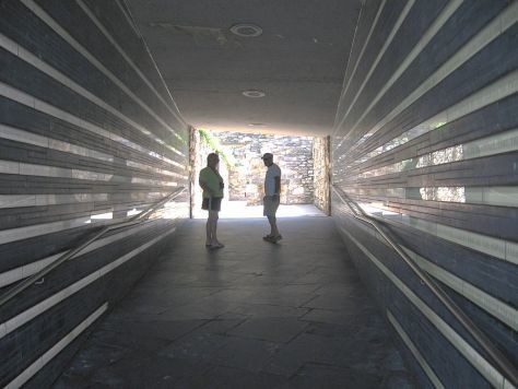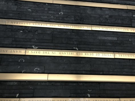 The Irish Hunger Memorial at Vesey Street and North End Avenue is a few blocks north of the Battery and flanking the Hudson. It’s a large structure incorporating an Irish cottage and stones from every Irish county. It commemorates the over one million who starved to death between the years 1845-1852, courtesy of the English. My friend and I walked south on the Hudson. We’re both used to watching the river activity :the different kinds of boats and the ferries which are once again plying their trade to New Jersey and Staten Island. So it was great fun to look inward at the beautiful gardens and to discover The Irish Hunger Memorial. It’s a beautiful, mysterious structure not without controversy, something dear to the Irish.