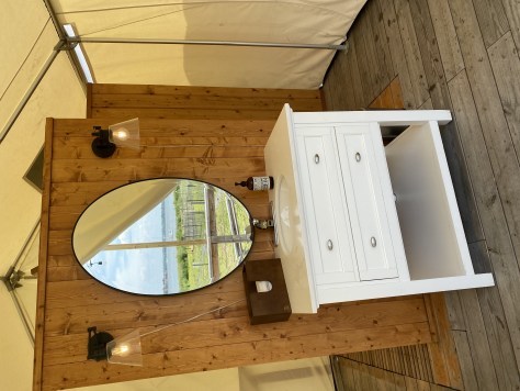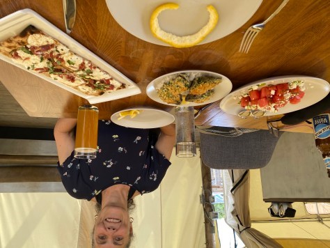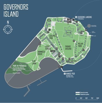 On Friday, A friend and I clamped on GOVERNORS ISLAND. We took the twelve noon five second ferry from the Maritime Building at the Battery along with ten million bikes and children, landed at Soissons and trotted south around the island. We passed Castle Williams (closed) and Half-Moon Battery (closed). After we walked around the southeast corner near Buttermilk Channel, we came upon Collective Governors tent city !!!! After gawking at the tents and peering at the double bed in the single tent rooms, we looked at one another: Could we, should we, dare we enter these hallowed grounds? The answer is evident. One of us was a native New Yorker and the other was a real estate agent. The employees at the entrance couldn’t have been more welcoming. We decided to have lunch and were escorted to a tent with an open view of New York Harbor. So Laurence of Arabia. Perfect luncheon of Rockefeller oysters, watermelon salad, flatbread and lots of beer. We politely snickered at the thought that our fellow diners (seniors, white and Asian) were paying close to $700 a day for the pleasure of bragging rights that you slept in a tent on Governors Island – or attempted to. The Ladies Rooms were across a gravel yard, past a fence opening, up a ramp and voilà, you had arrived at three little bathroom/shower combos with a sweet little vanity table. After, we circled around to the Soissons land and caught the three p.m. ferry back to Manhattan.