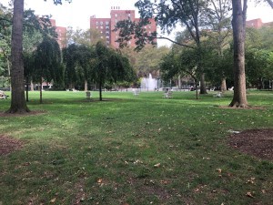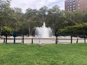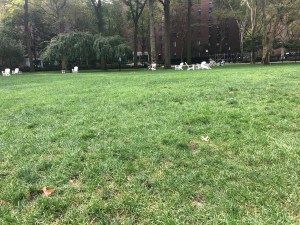 The 110 buildings are in a park-like environment of mostly plane trees. I’ve lived here for many years and consider myself very lucky. From my window I look north over the Oval, Stuyvesant Town’s central lawn. To the west I see the Empire State Building. At one time the lawns were sacrosanct, acres of undisturbed grass. Recently, there’s a hands on approach. Pets are allowed and Adirondack chairs dot the Oval lawn. At the center is a magnificent fountain.