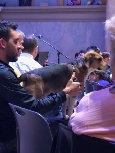 Judson’s blessing of the animals (many dogs, one stuffed snake called Eagle, several other stuffed animals) was a hoot. They broke bread in the form of animal biscuits distributed by Minister Micah Busey who was loving every minute of it. I asked a friend if she’d brought an animal and she named her husband. Well, he has a cute tail.