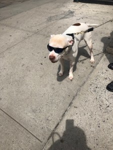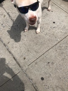 One of my favorite shows is Project Runway. One of my favorite places is F. I. T. Fashion Institute of Technology has great fashion exhibits. So with this in mind, let me present a chic NYC dog who’s sporting sunglasses.
