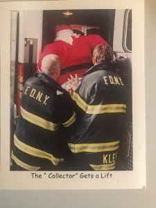 The Collector playing Santa with help from Engine Company 225 Photo by Deb Brozina.neighbors, giving them a great deal of credit for the documentary’s success. She talked about the heavy equipment that was and is still used to label the film industry as a guy’s world. Women couldn’t lift and lug the gear. No more! With the small digital cameras, women have as much opportunity to making a film as a man does.