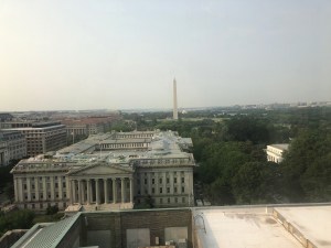 View from the Court of Appeals Chambersbig, beautiful, clean city with a metro that was so efficient it might have been Swedish. I visited the open court of the U. S. Court of Appeals for the Federal Circuit to witness my nephew, a judge, who was appointed by President Obama in 2013. The two mornings I was there the different judges discussed patent cases, a veteran who claimed his healthcare benefits were inadequate and the building of a road from a private New Mexico property across federal land. Although this court deals primarily with patent law its case load is hodgepodge. My nephew said this was done so that the judges did not develop too narrow a focus.