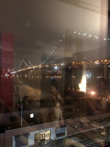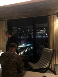 Our host, who is seated, and another guest.sight. People were talking to each other. Imagine, a club that’s glamorous and respects your privacy. Our generous host had a surprise for us. After dinner we walked through Dumbo to a hotel overlooking the East River. We took the elevator to the fifth floor where we entered a charming bedroom complete with champagne, wine and a view of the Brooklyn Bridge, Manhattan Bridge and Williamsburg Bridge. We had a marvelous time talking about old and new adventures.