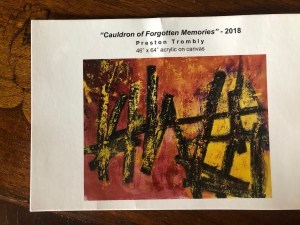 Thursday night I went to “Cauldron of Forgotten Memories” – 2018, a crowded, jolly exhibit of Preston Trombly’s wonderful, colorful, vibrant acrylic on canvas works.