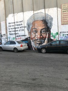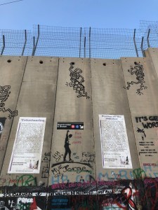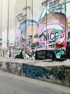 Wall Art, BethlehemAmerican scholars are restoring Herodion’s reservoir system. In Bethlehem we women wrapped our arms and head in scarves so the group could visit nearby Hebron’s Haram Al-Khalil, the Tombs of Abraham, Isaac, Jacob and their wives. We stayed near Banksy’s Walled Off Hotel in Bethlehem and had several delightful meals, surrounded by conceptual art about the current political climate. The photos are of the wall the Israelis built and of art in Banksy’s hotel. Next week: the Samaritans and lunch in a Bedouin camp