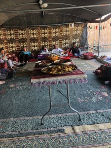 We were in Jericho for two days. On arrival we took the cable car to a 13th-century Greek-Orthodox monastery. Afterwards we had lunch at a Bedouin camp. We sat on soft cushions in a large tent while the men in the camp laid the table and brought in food. We had glimpses of very small children and several pregnant women but were not introduced to them.The lunch was tasty and ample. There were different kinds of chicken, falafel, hummus, pickled vegetables and pomegranates. Nearby was the Bedouins herd of goats. These Bedouin have been informed by the Israeli government that their camp will be shut down.
