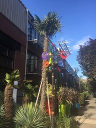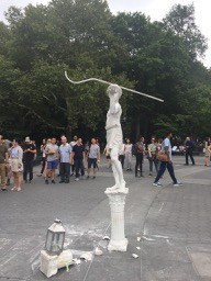 Returning to NYC from Portland, Or., I walked through Washington Square Park. The piano player was missing but the figure in paint was there. Home at last!