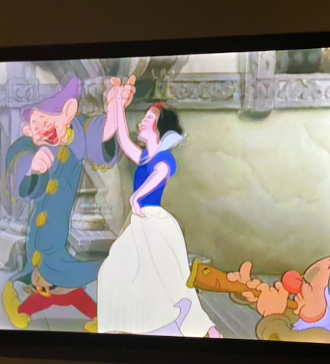 Snow White and Dopey cutting a rug. Is that Grumpy on the horn? 1937 movieYesterday, my museum pal and I stumbled upon the Met’s Costume exhibit. Such fun. Like the elderly teenagers we both are, we had a fine time criticizing and praising the various costumes. Here’s one of my favorites.