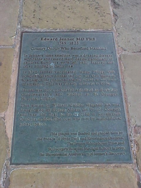 Plaque on Edward Jenner statue, Kensington Gardens, LondonAnother tribute to the world-renowned physician stands in Gloucester Cathedral, a monument to Gloucester's most famous hometown boy.