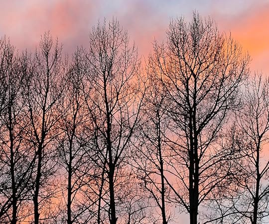 A Stand of Bare Trees Against a Colorful Winter Sky at Twilight by Derrick Neill.