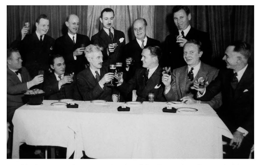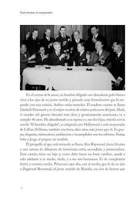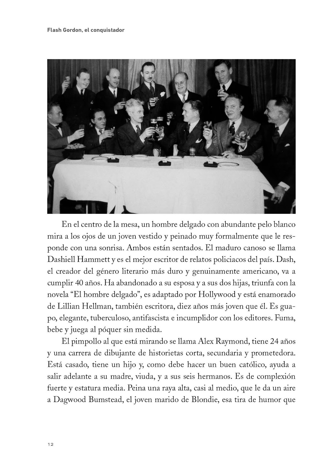 En la foto superior: Dashiell Hammett y Alex Raymond (izquierda y derecha, centro de la foto) entrechocan las copas para celebrar la aparición de la tira diaria Agente Secreto X-9. Como se sabe, aquella fue la tercera serie que dibujaría un jovencísimo Raymond, pronto influencia mundial en el medio, junto con la dominical Flash Gordon y su topper Jungle Jim. La foto está tomada de este recomendable libro recién aparecido en España, Flash Gordon el conquistador, de Javier Cuervo, del cual reproduzco portada y página original. Prosit!