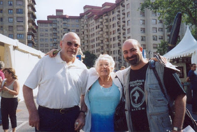 Mucho he escrito en este blog sobre Víctor Mora. Esta ficha Toutain la acompañé de un artículo que en su momento dirigí al mismo Mora sobre la importancia de su obra en mi ideología y forma de pensar. Y también escribí algunos artículos en Trueno, la revista de la Asociación de Amigos del Capitán Trueno, que a ver si subo algún día a este minarete. Por ello, no digo nada más. La foto es de julio de 2006, en la Semana Negra de Gijón. Asistí principalmente para conocer a Víctor Mora, que estaba todavía bastante convaleciente de esa enfermedad de la que nunca se recuperó del todo. Pocas veces se nos concede tener héroes en esta vida; menos aún se nos concede poder conocer a uno de esos héroes. En la foto, presidiendo, la maravillosa Armonía Rodríguez, su compañera fiel de toda la vida y adaptadora de cientos de novelas para aquella legendaria colección: Joyas Literarias Juveniles.