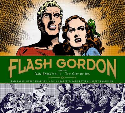 Soy feliz como una perdiz. La razón: ya ha aparecido en Inglaterra el primer volumen de la recopilación de la que será, esperemos, la recopilación completa del Flash Gordon de Dan Barry. Una de las obras maestras de la space-opera del tebeo clásico que con el viraje realista que le dieron Barry, Kurtzman y equipo, se volvió más ciencia-ficción que space-opera. Ya escribí largo y tendido sobre el amigo Flash en este viejo blogo. El primer volumen, cuya portada adjunto arriba, recuerda mucho la edición española de Panini que no prosperó y debió durar solo (¡ay!) un malhadado numerico que no se comió una rosca en el mercado. Nos dejó a todos chiflando en la loma y preguntándonos por qué el amigo americano no sacaba ya esta obra maestra en dibujos, caracterización de personajes, solidez de los argumentos, diálogos inteligentes, etc. Pues ya está aquí gracias a los hijos de la pérfida Albión. Es un tomo no tan ladrillote como aquellos a que nos tiene acostumbrados la americana IDW, sino más manejable, para llevárselo al camastro o para aquellos que leen tumbados. Excelente encuadernación, buen papel, 224 páginas, formato más grande que Panini, y reproduce tres tiras por página; lo malo: no parten de los originales, por lo que la reproducción de las tiras no es la ideal, pero tampoco es mala. Estupenda introducción de David Schreiner (de 1988) donde habla de la respetuosa pero tirante relación entre Dan Barry y el chispeante