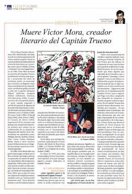 El pasado 17 de agosto, a las diez y media de la noche, mientras dormía, Víctor Mora abandonó este mundo. Por si alguien no lo sabe, Víctor fue, además de un grande entre los seres humanos, un extraordinario creador: escritor de historietas y novelista. Como escritor de tebeos/cómics (como prefiera usted llamarlos) no sólo fue el mejor de toda la historia de España, sino, también, uno de los grandes del cómic europeo. Sobre todo se prodigó en Francia, donde vivió durante años, harto de la presión que ejercía la dictadora franquista sobre la industria y, en general, sobre todos los españoles. Yo he distinguido siempre entre su obra "educativa" y su obra "lúdica". Ejem, ejem, me explico. Ésta última es la de series como Sunday, Felina, Las crónicas del Sin Nombre, Los ángeles de Acero y muchas otras, publicadas en Europa. Pero los que influyeron en los niños de mi generación, los que nos inculcaron valores, principios e ideales, fueron los tebeos de su obra "educativa": aquella obra que Mora escribió para la Editorial Bruguera. El Capitán Trueno, la más influyente y la más famosa; pero también El Jabato, El Sheriff King, El Cosaco Verde, y muchas otras, como Supernova, mi querida pecosa de oro. Y sobre todo, sobre todo, sobre todo, el canto de cisne del tebeo popular español y su obra maestra, sin discusión: El Corsario de Hierro.