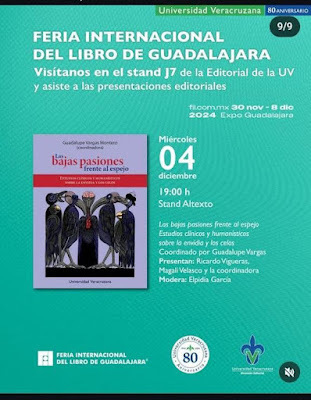 Dicen que no hay dos sin tres, y este año toca de nuevo asomarse a la Feria Internacional del Libro (FIL) de Guadalajara. En este caso, no presento libro de mi autoría, sino, por una parte, el excelente volumen de ensayos coordinado por Gudalupe Vargas Montero, Las bajas pasiones frente al espejo. Estudios clínicos y humanísticos sobre la envidia y los celos (Universidad Veracruzana). Es el primer volumen de una serie dedicada a los llamados "pecados capitales" o emociones humanas. En segundo lugar, presentaré el libro de Elpidia García Delgado (compiladora), Elocuencia del yantar (Acoso Textual Ediciones), donde