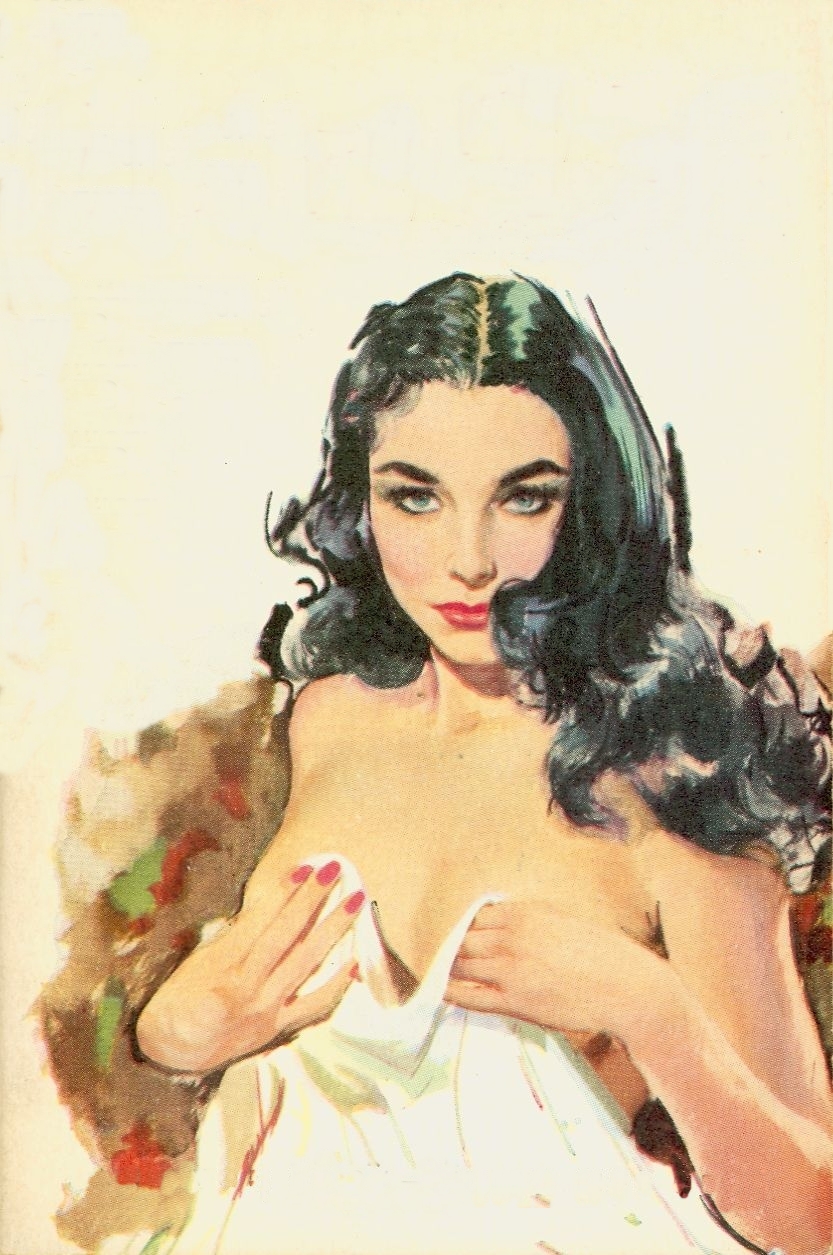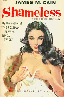 Una muy joven Liz Taylor debió de servir como inspiración de esta portada de Shameless, de James M. Cain, el glorioso autor de El cartero siempre llama dos veces. Esta novela de Cain, publicada en esta edición por Avon Books en 1951, es hoy muy difícil de hallar. En algunas librerías de internet, especializadas en bibliografía raruna, se vende a 35 dolarucos. Debo decir que mi ejemplar lo conseguí en la calle Donceles de México D.F., donde había apilados varios cientos de paperbacks gringos, por 1 pesito mexicano (0,0646 centavos de dólar; 0,0591 céntimos de euro). La portada, que no viene acreditada en esta edición, es del maravilloso ilustrador James Darcy, quien también había ilustrado otras novelas de Cain. Mi copia está tan nueva que no necesité arreglar nada, pero les dejo abajo la portada sin rótulos.