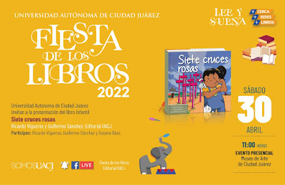 ¿Es posible explicar el feminicidio a los niños? Creo que es necesario intentarlo. Después de dos años de estancamiento por la pandemia, aparece Siete cruces rosas, mi cuento infantil ilustrado bellamente por Guillermo Sánchez "Gemó". Mañana a las 11 lo presentamos para cerrar La Fiesta de los Libros 2022 en el Museo de Arte de Ciudad Juárez. Están cordialmente invitados. Vendrán más presentaciones.