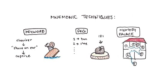 The keyword method allows you to memorize a word by linking it through an intermediate and fantastical picture. The French word chavirer, which means to capsize, gets transliterated into “shave an ear,” and you picture a bearded ear shaving itself in a canoe that’s tipping over.The peg method first links images to numbers (one is “bun,” two is “shoe,” etc..) and then combines these into elaborate visual imagery to encode and recall arbitrary numbers and dates.The memory palace uses a mental stroll through a familiar location. You insert fantastical imagery along a pre-remembered linear sequence, allowing you to graft arbitrary information onto this prior structure.