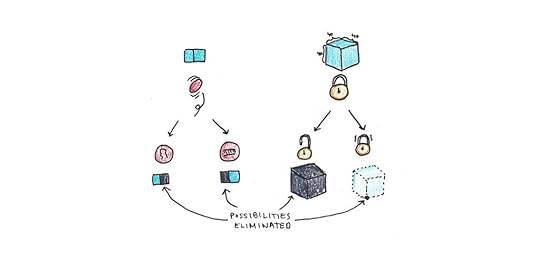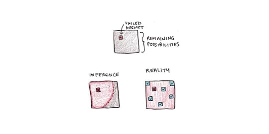 This doesn’t hold if one outcome is far more likely than another. If I try to open a 40-number combination lock with a random, 3-digit code, my chance of opening it is only one in 64,000. Failure here only reduces the space of possibilities by one—hardly any information at all. In contrast, if I had opened the lock successfully, I would have eliminated any remaining uncertainty.