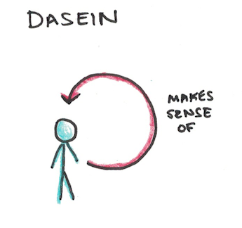 You can see what Heidegger means by “world” when you hear expressions like “the business world” or “the world of basketball.” These expressions aren’t pointing to the electrons that make up mergers or lay-ups, but the fact that these domains are backgrounds upon which cultural practices reside.