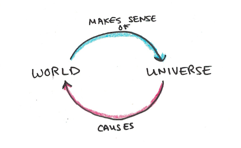 The world is not the universe. The universe is full of atoms and leptons and photons and stuff. It’s what physics studies. The world, in Heidegger jargon, in contrast, is something very human. Indeed, having one may be our defining quality.
