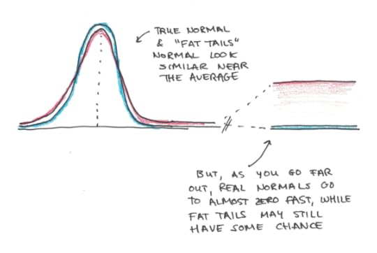 In particular, he argued, we often have distributions which have “fat tails” as he calls them. Remember the original normal distribution? It goes down even faster than exponential decay, so the tails are, mathematically speaking, quite slim. In real life, NNT argues, we tend to see events that are in the extreme tail ends more often than we would by normal distributions, and so this gives us too much confidence that rare “black swan” events are statistically impossible.