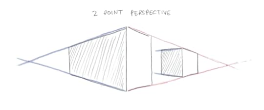 Two-point perspective has two vanishing points. This happens when you’re looking at the corner of a building, and you want to consider two streets going off in each direction. The idea here being that what is in the middle is largest, with everything to the left and right getting smaller and smaller.
