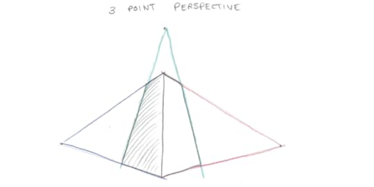 Three point perspective has, you guessed it, three vanishing points. This is like two-point perspective, except now it also recedes above you. This is often the case when you’re looking up at a tall building and the top of the building takes up less room than the bottom, even thought each floor is (in the 3D world) the same size.