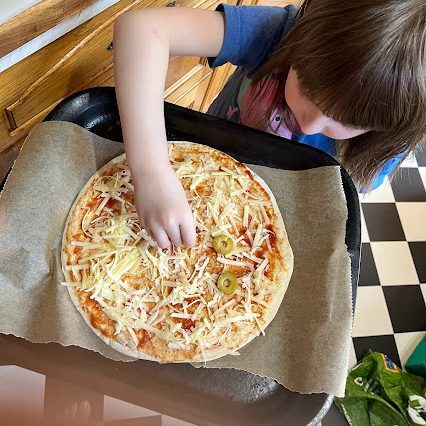 Image copyright Mabh Savage 2023. Image ID: A little girl putting olives on a pizza seen from above.