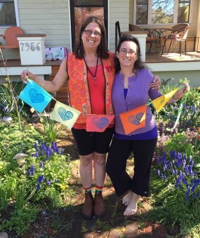 (Denise) We met almost exactly 2 years ago when I had gotten a small grant from the Department of Neighborhoods to make batik hearts at an Earth Day/Connect the Dots event at Seattle University. The day I received the grant award, I attended a Stand for Compassion event in Occidental Square and heard Susan speak. I’d included a small stipend in the budget and in that moment, I decided to reach out to Susan, rather than hire someone familiar. I stepped out of my comfort zone and tracked Susan down through Real Change. We worked really well together. Susan and I became friends. We had supplies left over, so we kept setting up heart-making stations in community settings. We loved the process… “You wear a heart someone else makes and somebody else wears your heart” are the words that Susan uses to describe our process and we noticed that extraordinary conversations would take place around the painting table. Over the past 2 years, we’ve facilitated making over 2000 hearts, witnessed many “aha’s!” and seen new friendships take root and blossom.