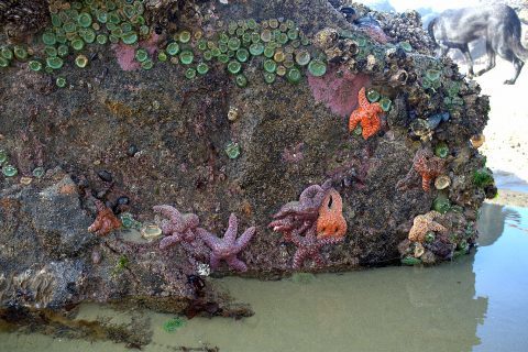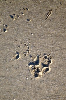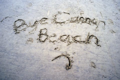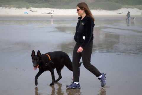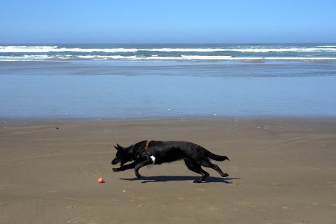 We followed the shoreline back toward Cannon Beach. I swung Bella’s leash in my right hand while she herded waves on my left. By the time we reached the rock wall at Arcadia State Park, the tide had gone out enough that we could walk around it without getting wet. Now that it was almost noon, small groups of matchstick-sized people wandered the beach. Some of them were walking toward us.
