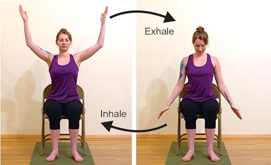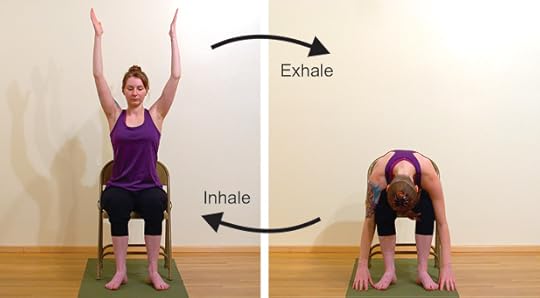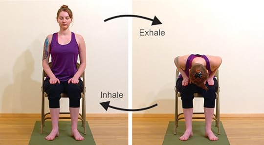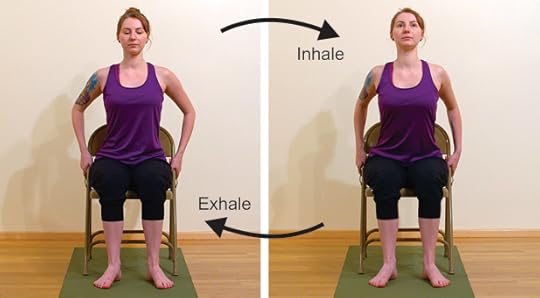 4. Grasp the sides of the back of your chair with the palms facing inward. On inhale, gently squeeze the shoulder blades together as you lean your rib cage forward and away from the chair. This should have a gentle back bend quality. On exhale, release back up to sitting. Do this 6 times, then stay leaning forward for 4 breaths, lifting the ribs with each inhale.