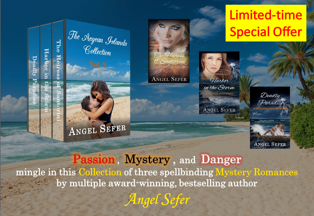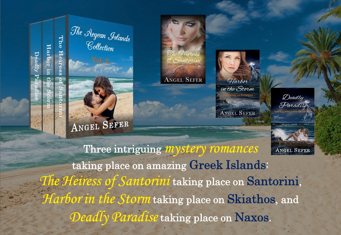 I'm so excited about my latest release, The Aegean Islands Collection Vol. 2. It is a collection of three passionate and intriguing mystery romances taking place on enchanting Greek Islands of the Aegean Sea. This second volume includes: The Heiress of Santorini taking place on Santorini, Harbor in the Storm taking place on Skiathos, and Deadly Paradise taking place on Naxos.