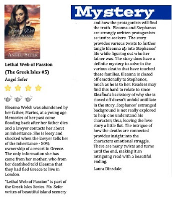 “Ms. Sefer writes of beautiful island scenery and how the protagonists will find the truth. Eleanna and Stephanos are strongly written protagonists as justice seekers. The story provides various twists to further tangle Eleanna up into Stephanos’ life while figuring out who her father was. The story does have a definite mystery to solve in the various deaths that have touched these families… The intrigue of how the deaths are connected provides insight into the characters emotional struggle. There are many twists and turns until the end, making it an intriguing read with a beautiful ending.” — InD’tale Magazine