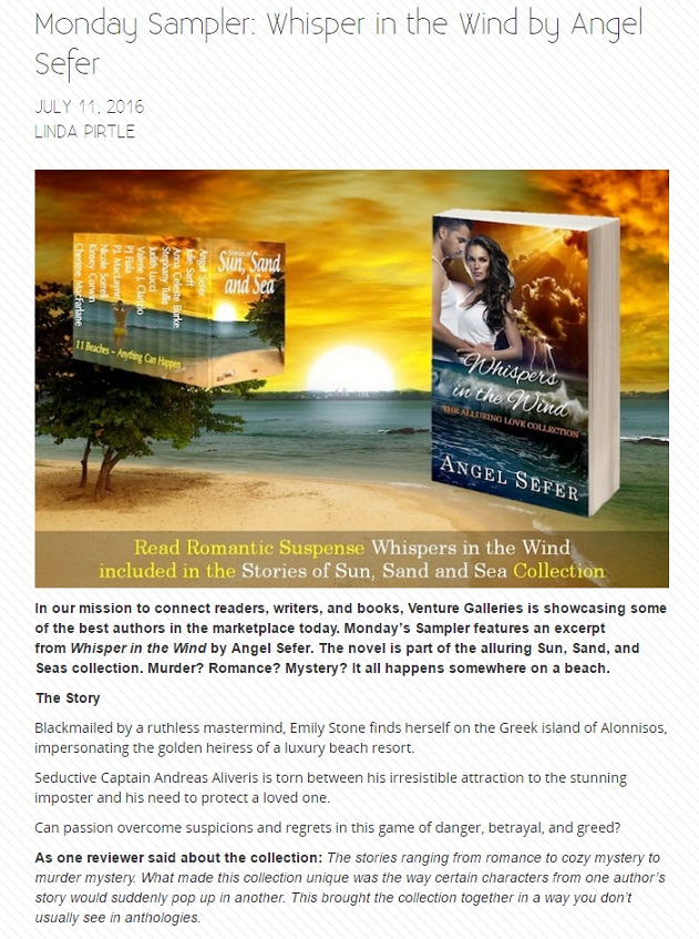 In our mission to connect readers, writers, and books, Venture Galleries is showcasing some of the best authors in the marketplace today. Monday’s Sampler features an excerpt from Whisper in the Wind by Angel Sefer. The novel is part of the alluring Sun, Sand, and Seas collection. Murder? Romance? Mystery? It all happens somewhere on a beach.The StoryBlackmailed by a ruthless mastermind, Emily Stone finds herself on the Greek island of Alonnisos, impersonating the golden heiress of a luxury beach resort.Seductive Captain Andreas Aliveris is torn between his irresistible attraction to the stunning imposter and his need to protect a loved one.Can passion overcome suspicions and regrets in this game of danger, betrayal, and greed?As one reviewer said about the collection: The stories ranging from romance to cozy mystery to murder mystery. What made this collection unique was the way certain characters from one author’s story would suddenly pop up in another. This brought the collection together in a way you don’t usually see in anthologies.
