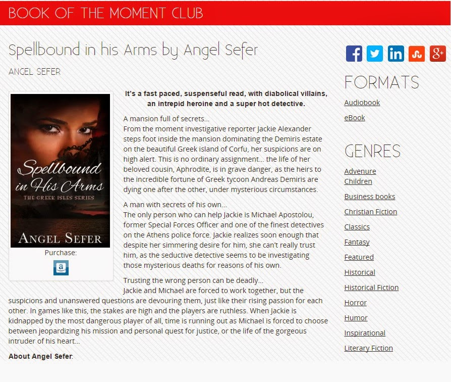 9 of 9 people found the following review helpful5.0 out of 5 stars Island Adventure!, March 14, 2015By 1D82 Many (London) - See all my reviewsThis review is from: Spellbound in His Arms (The Greek Isles Series Book 1) (Kindle Edition)Great to have a different setting for romance story. I really liked the fact that this book was set on a Greek island. Very romantic and very different. (And informative - I had no idea that there were so many forests on Greek islands!)