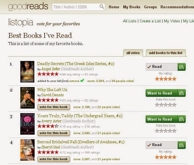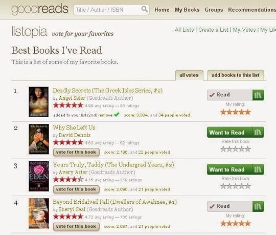 I'm so excited that "Deadly Secrets", my 2nd mystery romance novel in "The Greek Isles Series", has been voted by readers as #1 among "The Best Books I've Read".