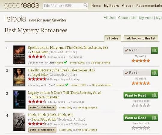 I am thrilled that my 1st and 2ndnovels in “The Greek Isles Series” have been voted by readers on Goodreads as the Best Mystery Romances.