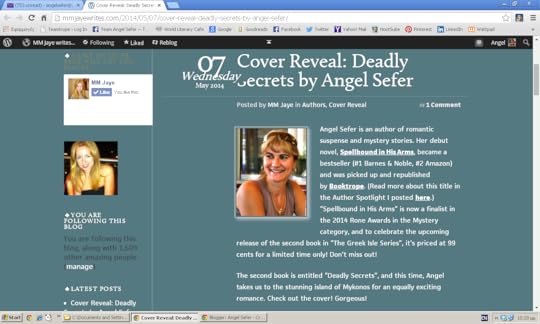 Angel Sefer is an author of romantic suspense and mystery stories. Her debut novel, Spellbound in His Arms , became a bestseller (#1 Barnes & Noble, #2 Amazon) and was picked up and republished by Booktrope . (Read more about this title in the Author Spotlight I posted here .) “Spellbound in His Arms” is now a finalist in the 2014 Rone Awards in the Mystery category, and to celebrate the upcoming release of the second book in “The Greek Isle Series”, it’s priced at 99 cents for a limited time only! Don’t miss out!The second book is entitled “Deadly Secrets”, and this time, Angel takes us to the stunning island of Mykonos for an equally exciting romance. Check out the cover! Gorgeous!Read the entire post at mmjayewrites.com