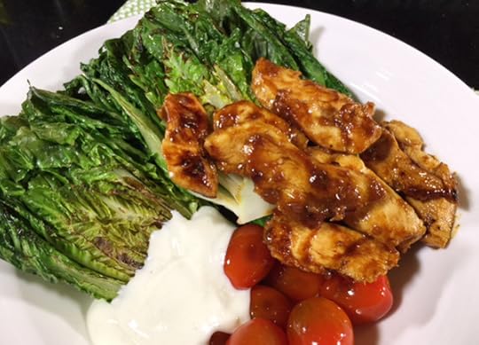 Salad komplet ini cocok untuk yang sedang berdiet. Cos lettuce yang manis renyah dipanggang dan dipadu dengan ayam panggang yang gurih enak. Saus yogurtnya membuat rasanya makin renyah segar.