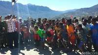 Senyum 20 anak Distrik Ilaga, Kabupaten Puncak, Papua tetap tersungging walau kakinya terasa panas menginjak jalan tanpa sepatu.