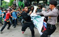 Demo di depan gedung KPK yang dilakukan massa Himpunan Mahasiswa Islam (HMI) berlangsung ricuh. Polisi menghadang, bentrok pun pecah.